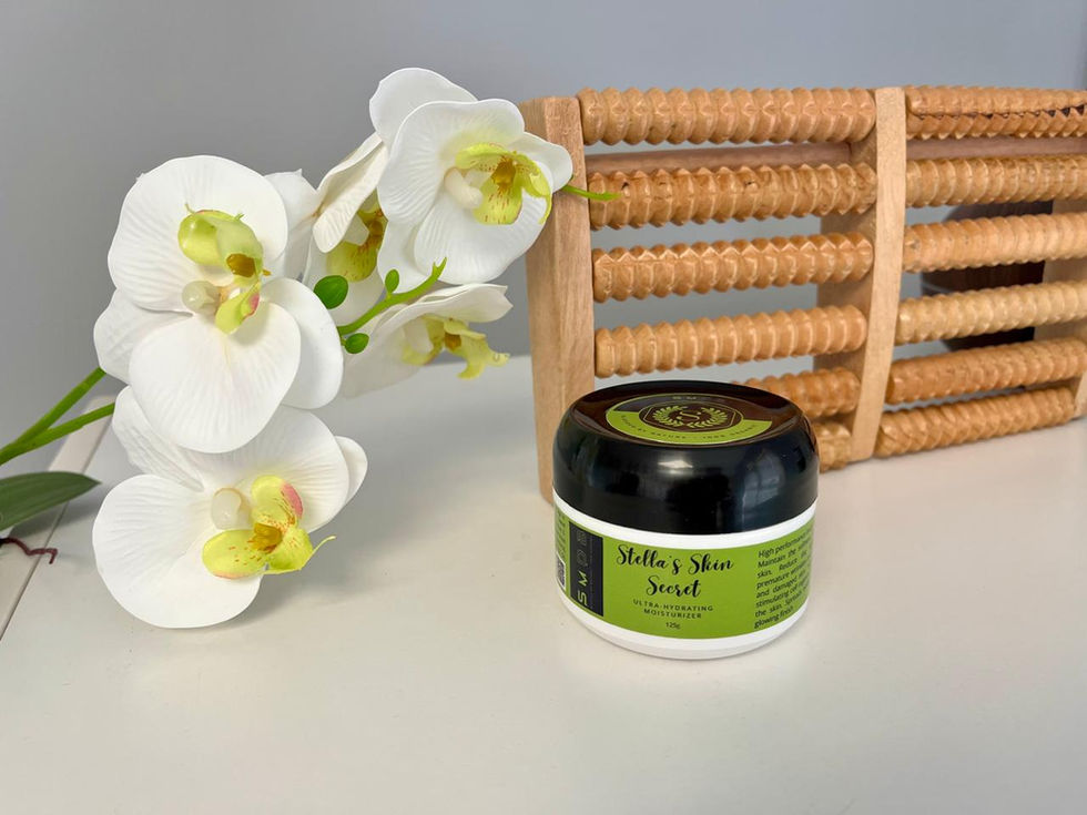 Stella’s Skin Secret Ultra-Hydrating Moisturiser is a premium, 100% organic skincare product designed to rejuvenate and restore skin vitality. Packaged in a sleek black jar with a green label and matching lid, it features a botanical logo and the tagline “PUREST NATURE – 100% ORGANIC,” reinforcing its commitment to natural ingredients and holistic wellness.